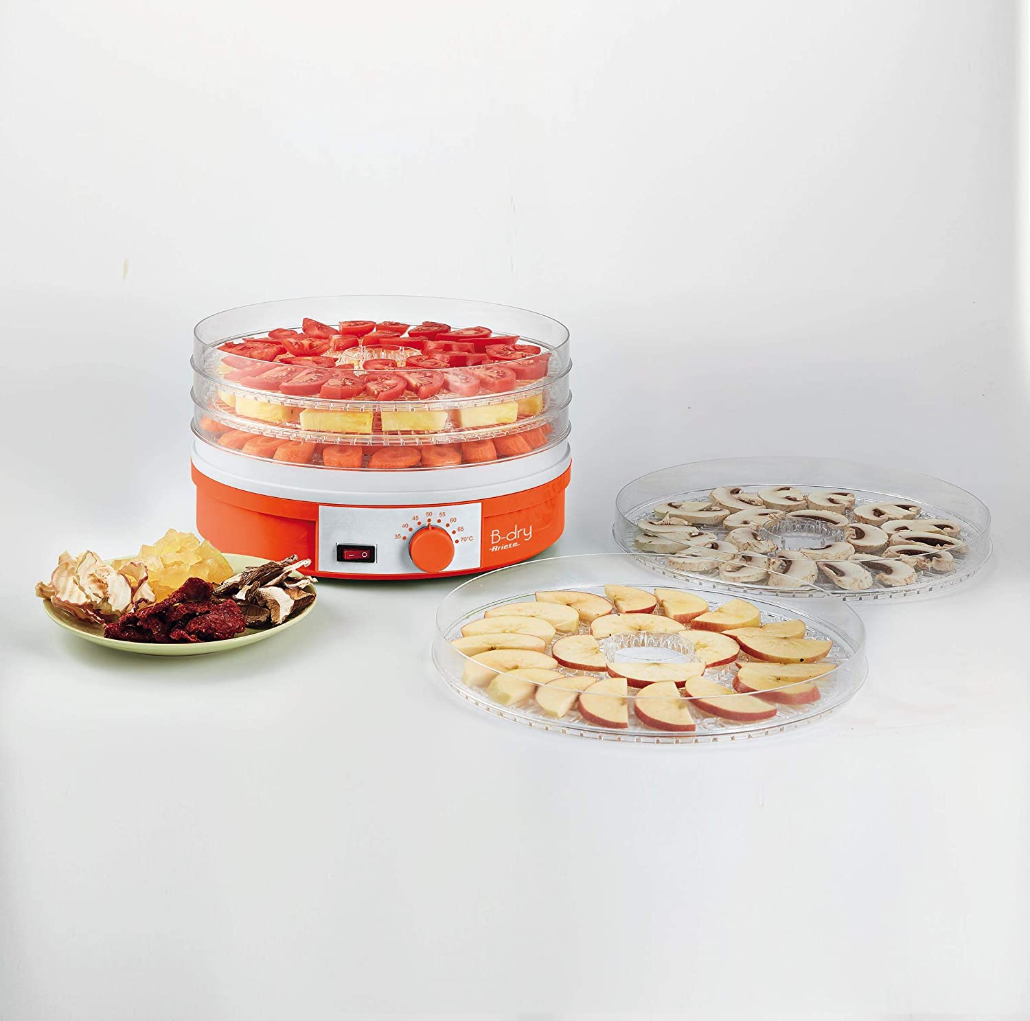 به کمک پراکننده نمودن گرما در خشک کن B-Dry آریته آب میوه ها در عین حفظ مواد معدنی و ویتامین تبخیر می شود. 5 طبقه سینی متحرک میوه خشک کن این امکان را برای خشک نمودن انواع مواد غذائی را می دهد. B-Dry این امکان را جهت خشک نمودن میوه، سیفی جات، قارچ ها، سبزیجات و گوشت برای مدت زمان بیشتر می دهد. B-Dry آریته بهترین راه حل برای حفظ مواد غذائی در طولانی مدت بدون هیچگونه مواد افزودنی و نگهدارنده می باشد، و محصول ایده آل برای حفظ طعم و بوی غذای سالم می باشد.