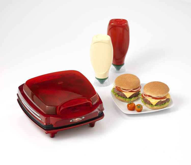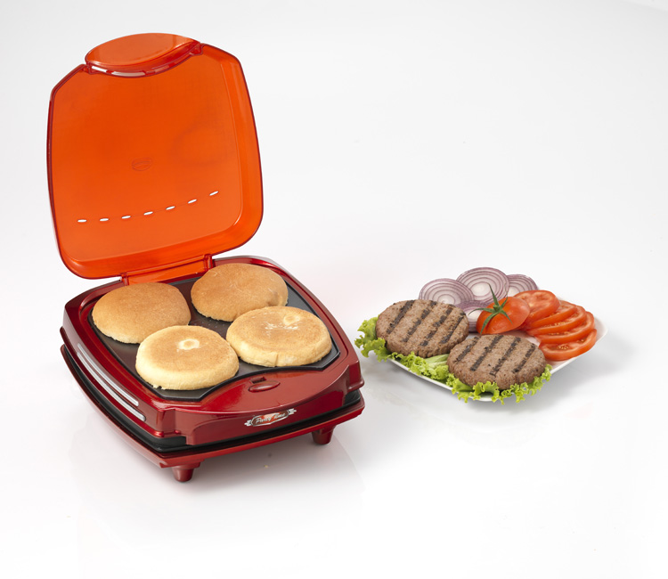 دو صفحه گریل مناسب برای تهیه دو عدد همبرگر، صفحه بالا گرمکن نان مخصوص همبرگر همزمان با پخت گوشت. همزمان ظرف 5 دقیقه 2عدد همبرگر حاضر می شود.