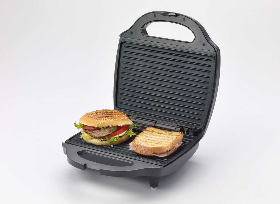 ساندویچ ساز و استیک پز با صفحه های ثابت. سطح تفلون صفحات این امکان را به شما می دهد تا به راحتی دستگاه را تمیز کرده و بعلت کم جا بودنش، در هر فضائی آن را می توانید نگهداری نمائید.